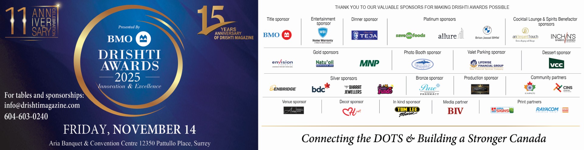 A huge shout out to all the sponsors to the 11th annual Drishti Awards Gala, a spectacular celebration recognizing the innovative and remarkable contributions of outstanding individuals and organizations dedicated to service, leadership, and positive change in our communities in building a stronger Canada.