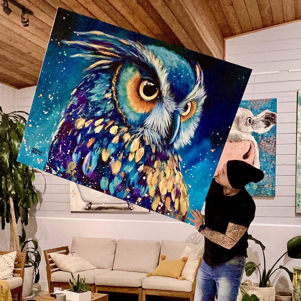 Jordan became self-taught by chance, diving headfirst into experimentation, spills, and happy accidents. What started as casual fun evolved into a distinctive style: bold, large-scale portraits of people and animals that radiate energy, emotion, and personality. Each brushstroke tells a story, and every painting invites viewers into Jordan’s world—one where color, motion, and heart take center stage.
